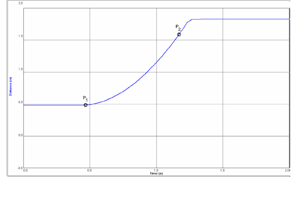 Look at the graph on the calculator. Assume that the upward sloped curve on the graph is the right half of a parabola. Choose 2 data points, P1 and P2, (time, distance). Choose the first on the vertex of the parabola, and the other about 1/4 of the way from the top of the incline. See the sample graph below. Record these in the table.