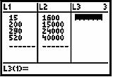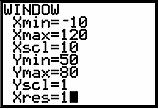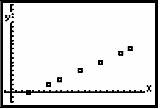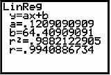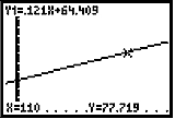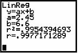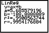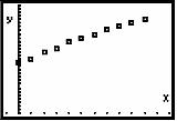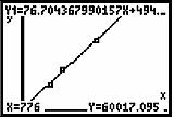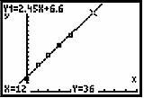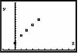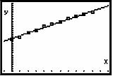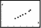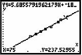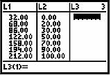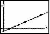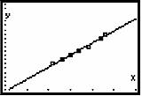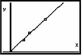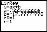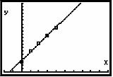 After entering the data into the calculator, graph the data. The Fahrenheit data, listed in L1, represents the x-axis, and the Celsius data, listed in L2, represents the y-axis. Your screen should look like the following:Step Two: Now we need to find a linear equation that models the data we have plotted. According to the calculator, our equation has the following properties: