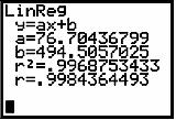 Based on the graph and the equation information listed above, our correlation coefficient (r) is equal to 1. That means that our data perfectly models a linear function.Step Four: Using the model from step two and the graph on our calculator from step three, we can trace along the graph and determine what temperature in degrees Celsius equals 98.6 °F, our body temperature.