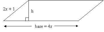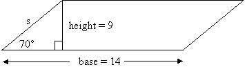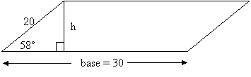 This type of problem involves relationships among the lengths of the sides and height as well as the area and perimeter of a parallelogram. We need to focus on two formulas: (1) area which requires a measurement of the base and height, which we call h and (2) the perimeter which is the sum of all four sides. Sometimes it is useful to remember that the opposite sides of a parallelogram are always equal. Sometimes an angle of the parallelogram is also given so that we can use one of the basic trigonometric ratios of sine, cosine, or tangent to calculate the length of the height.