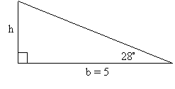 Suppose in a right triangle one of the legs is of length 5 and the angle formed by the hypotenuse and this leg is 28°. What are the area and perimeter of this triangle? A diagram is shown below.A right triangle is a special case of this type of problem since the legs are perpendicular. One leg is the base and the other is the height or altitude of the triangle. In order to find h in the diagram above we use