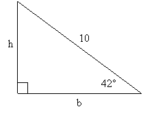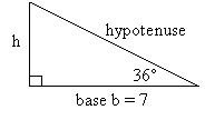 Suppose in a right triangle one of the legs is of length 5 and the angle formed by the hypotenuse and this leg is 28°. What are the area and perimeter of this triangle? A diagram is shown below.A right triangle is a special case of this type of problem since the legs are perpendicular. One leg is the base and the other is the height or altitude of the triangle. In order to find h in the diagram above we use