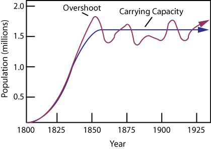 The graph above represents a typical carrying capacity graph, or the maximum population size a certain environment can support for an extended period of time, for a population of a particular species. Under ideal conditions, a population naturally increases until it overshoots the carrying capacity. At this point, the environment can no longer provide for the species, due to a number of different environmental resistances, including food, crowding, competition, etc. The population, due to lack of resources, will begin to die out, allowing the environment to recover. As the environment recovers, the species population is able to flourish once more. This leads to a fluctuation between the prosperity of the species and the prosperity of the environment (hence the fluctuations in the graph). This type of growth is called logistic growth.