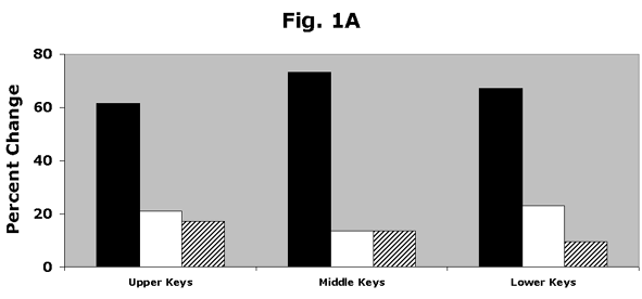 Look at the graph (Fig. 1A). In the Upper Keys, the percent of sites increasing and decreasing in population differ by approximately what percent?