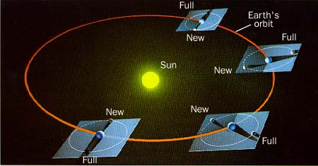 | 7 | Since the Moon circles the Earth at a five degree slant from the Earth-Sun plane, the Earth, Moon, and Sun rarely come into exact alignment. Based on our knowledge of solar eclipses, they can take place only when the Moon is in its new phase and its shadow can fall on the Earth’s surface. Furthermore, a lunar eclipse can occur only when the Moon is in its full phase and the shadow of the Earth can fall on its surface. If we number the positions on the above diagram clockwise from the top, a solar eclipse is illustrated in the 4th picture when the shadows of the Earth and Moon align and the Moon is in its new phase. The 3rd picture shows how the 5º slant between the Earth-Sun plane and the Moon's orbital plane causes the shadows to be out of alignment. A lunar eclipse is illustrated in the 1st picture when the shadows of the Earth and Moon align and the Moon is in its full phase. It is interesting to note that once the Earth and Moon are in the same plane as the Sun it is typical for both a solar and a lunar eclipse to occur within two weeks of each other, the amount of time necessary for the Moon to move from its new to full phase, or half of a lunar month! | ||||