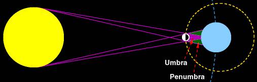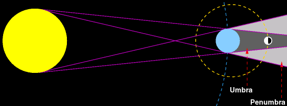 | 4 | As stated earlier, in a solar eclipse the shadow of the Moon is cast upon the Earth. Various parts of the Earth are covered to a different extent. People covered by the penumbra will see a partial eclipse of the Sun. Those inside the umbra will see a total eclipse of the Sun. | ||||