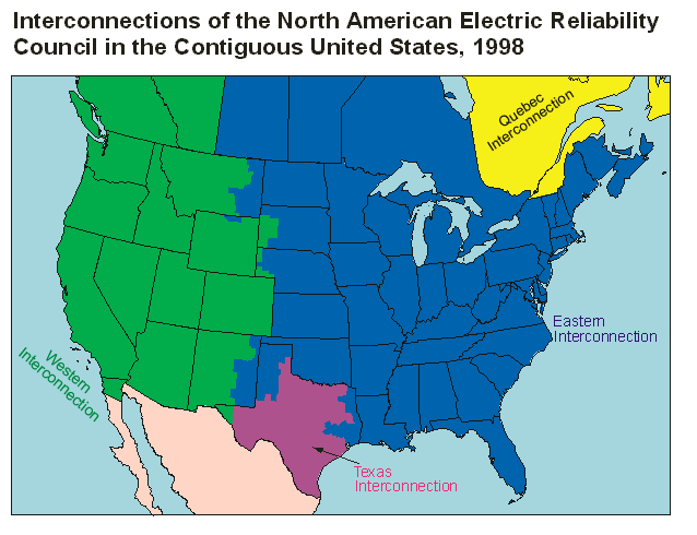 | 10 | On a larger scale, these systems of power generation, transmission and distribution are all interconnected in a single network which is often incorrectly referred to as the "national power grid." This gigantic network is divided into three subdivisions: the Eastern Interconnect, the Western Interconnect, and the Texas Interconnect. All distribution lines within the country, as well as Mexico and Canada, are interconnected allowing power companies to share resources. | ||||||||||