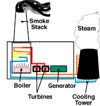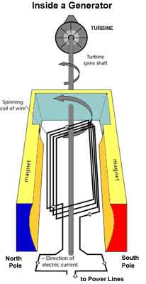 | 3 | In most cases coal and oil are burned to generate steam which is used to turn a turbine which then spins a generator. As the coil turns inside the generator, a permanent external magnetic field induces an alternating current (AC) of electricity in the coil.