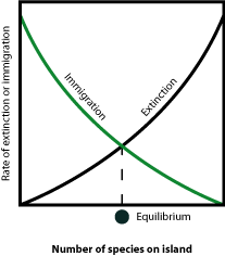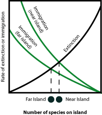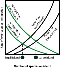 The theory of island biogeography, developed by Robert MacArthur and Edward O. Wilson, looks to explain the differences in species diversity with island size (for example, why large islands tend to have a greater number of species of a certain category than small islands). MacArthur and Wilson proposed that the number of species found on an island can be determined by a balance between the immigration rate (or the movement of species onto the island from other islands) and the extinction rate (or the rate at which species already on the island become nonexistent). [see graph 1]