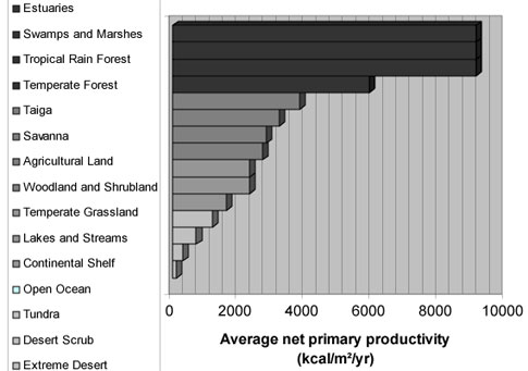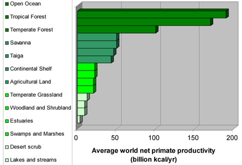 For example, in the first graph, the open ocean ranks toward the bottom in regards to NPP. However, in the second graph, the open ocean is the highest ranked. This is because oceans cover about 71% of the planet's surface, and while their individual NPP may be low, they cover such a large portion of the earth that the total world NPP is much, much higher.