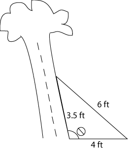 After the hurricane, the small tree in my neighbor’s yard was leaning. To keep it from falling, we nailed a 6-foot strap into the ground 4 feet from the base of the tree. We attached the strap to the tree 3½ feet above the ground. How far from vertical was the tree leaning?