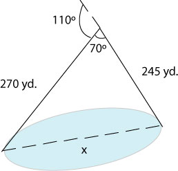 To approximate the length of a lake, a surveyor starts at one end of the lake and walks 245 yards. He then turns 110º and walks 270 yards until he arrives at the other end of the lake. Approximately how long is the lake?