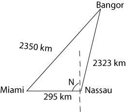 The distance on a map from the airport in Miami, FL to the one in Nassau, Bahamas is 295 kilometers due east. Bangor, Maine is northeast of both cities; its airport is 2350 kilometers from Miami and 2323 kilometers from Nassau. What bearing would a plane need to take to fly from Nassau to Bangor?