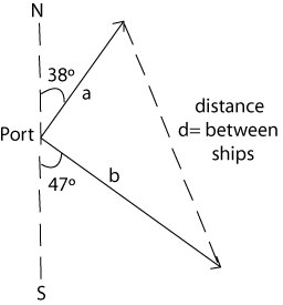 Two ships leave port at 4 p.m. One is headed at a bearing of N 38 E and is traveling at 11.5 miles per hour. The other is traveling 13 miles per hour at a bearing of S 47 E. How far apart are they when dinner is served at 6 p.m.?
