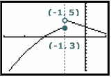 In this case, we say thatSince these limits are different, we say that the ONE limit as x approaches –1 does not exist. In order for this limit to exist, both the left hand and right hand limits would have to be the same, and the graph would have to “connect” from the left and right sides.These limits from the left and right have different values. Looking at a graph from a calculator screen, we can see that the left hand graph and the right hand graph do not meet in one point, but the limits from the left and right sides can be seen on the graph as the y values of this function for each piecewise-defined part of the graph. Notice the “open” circle and "closed" circle on the graph.