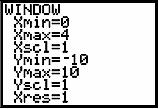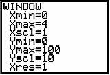 is always positive. We set a WINDOW for Y values from 0 to 100 and X values from 0 to 4. The graph of this function and the WINDOW are shown below.