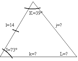 Solve the following triangle for all unknown side and angle measurements. Givens: J = 73°, K = 39°, and l = 14.