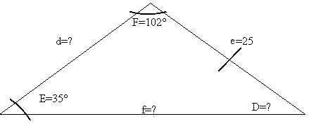 Solve the following triangle DEF where E = 35°, e = 25, F = 102°.